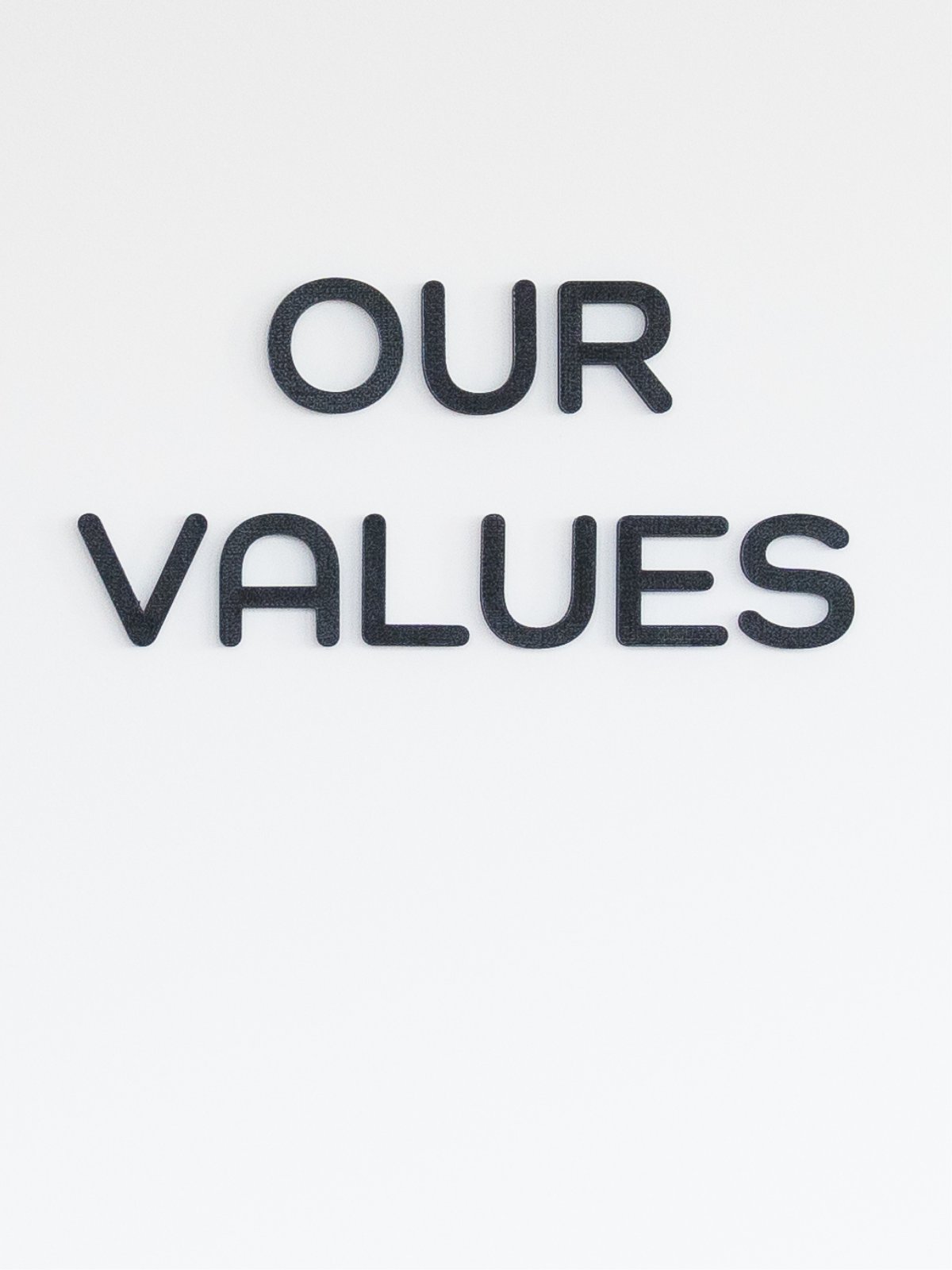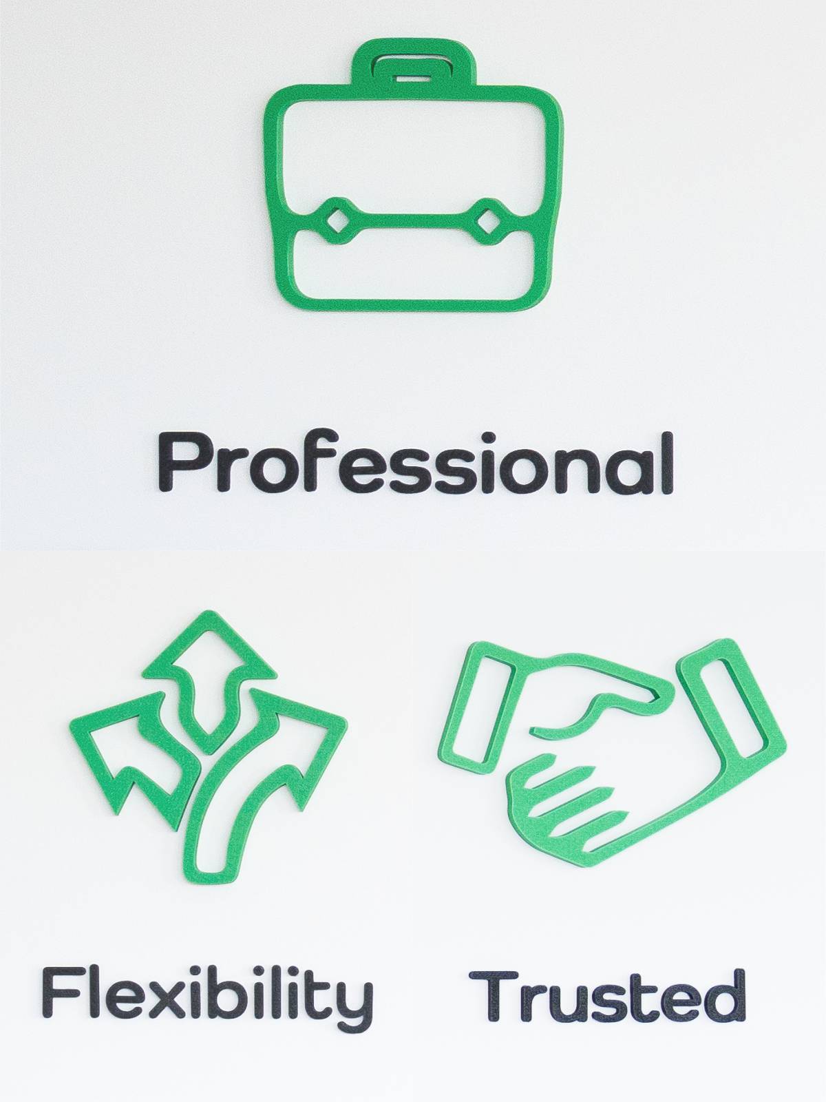 Die Mission wurde mit 3D Schriftzügen auf 8 mm starkem schwarzem Acrylglas umgesetzt. Schriftart, Farbgebung und Formensprache entsprechen exakt dem Corporate Design. Die Firmenwerte und Ziele werden dadurch, sonst nur in digitaler Form vorliegend, physisch greifbar und dauerhaft im Bewusstsein der Mitarbeiter verankert.