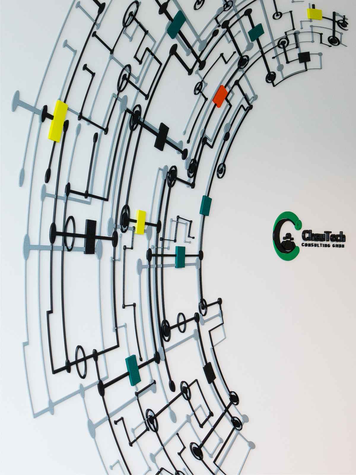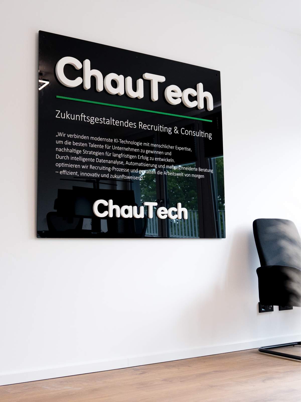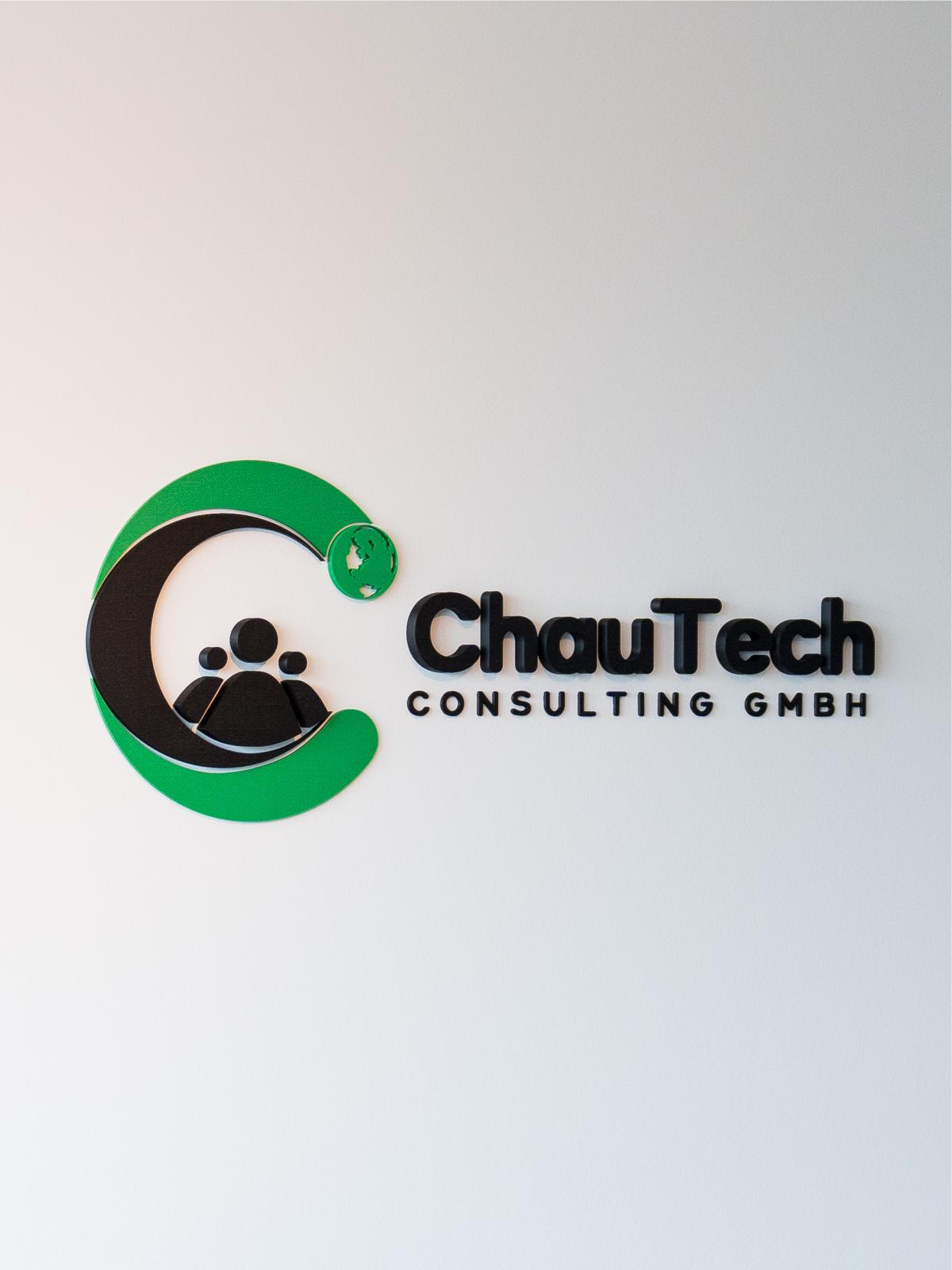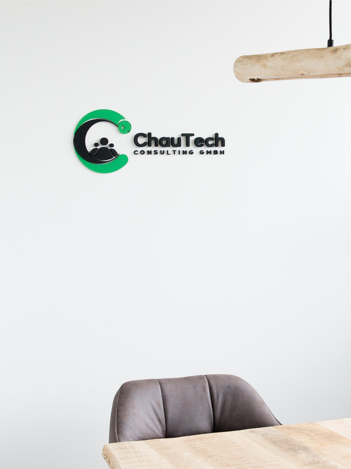 Das zentral platzierte 3D Logo der ChauTech Consulting GmbH bildet den visuellen Ankerpunkt des Raumes. Es überträgt das Erscheinungsbild der digitalen Markenwelt unmittelbar in die physische Umgebung und schafft so eine nahtlose Verbindung zwischen Website, Erstkontakt und persönlicher Begegnung. Die Farbigkeit und Typografie entsprechen exakt der Corporate Identity und sorgen für Wiedererkennbarkeit auf den ersten Blick.