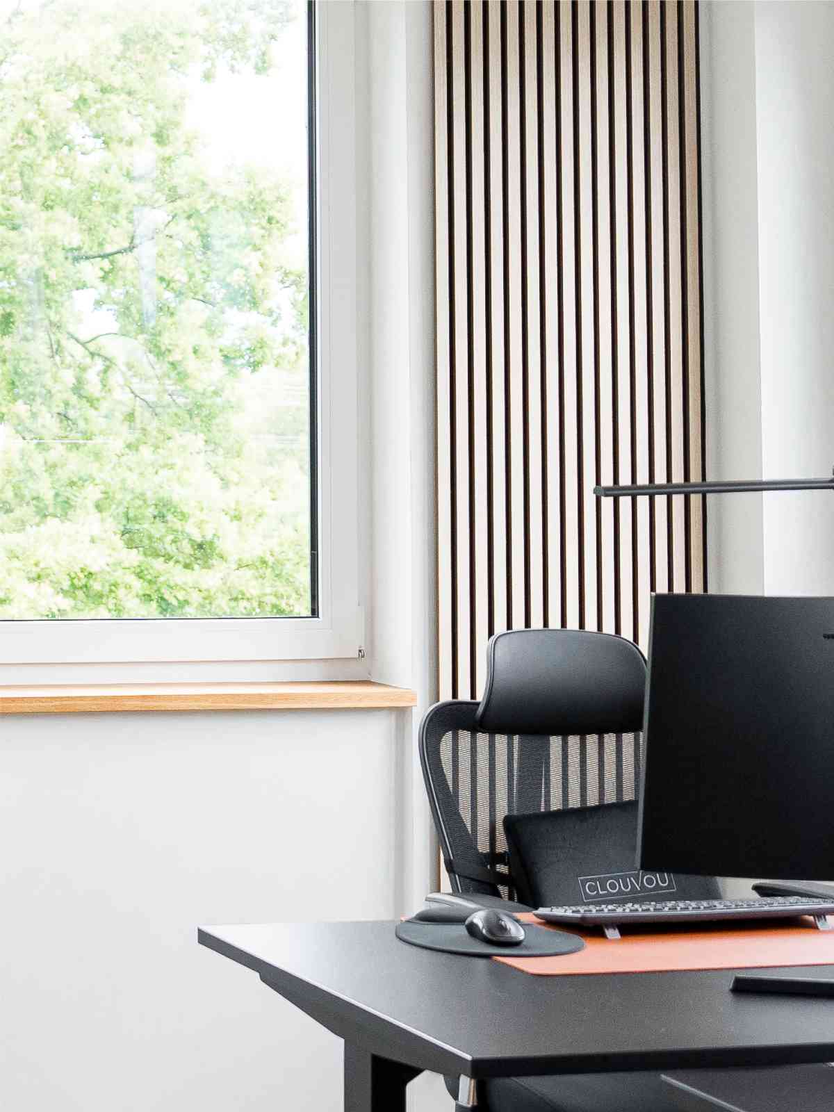 Die Räumlichkeiten der ChauTech Consulting GmbH befinden sich in der obersten Etage eines modernen Neubaus in Hamburg. Unmittelbar nach dem Betreten des Eingangsbereich öffnet sich dem Betrachter ein klar strukturierter Flur. Helle, weiße Wandflächen erzeugen eine sachliche, aufgeräumte Grundstimmung, während vertikale angebrachte Holzlamellen gezielt Wärme und räumliche Tiefe erzeugen. Der Raum wirkt hierdurch aufs Wesentliche reduziert und vermittelt den Eindruck eines Umfeldes, dass einen hohen Anspruch an Professionalität, Vertrauen und Zuverlässigkeit legt.