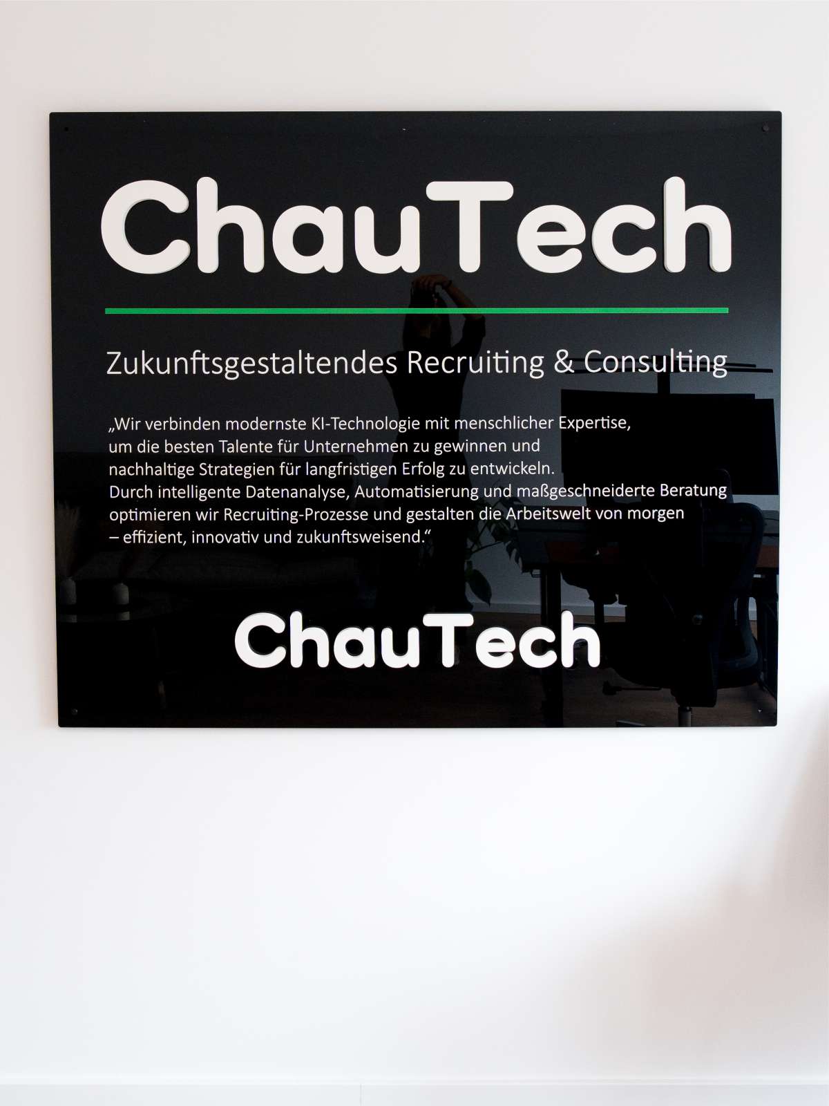 Für die Gründer der ChauTech Consulting GmbH (IT-/Engineering-Recruiting) stand früh fest, dass der Anspruch die neuen Büroräume mehr sein sollten als funktionale Arbeitsflächen. Sie sollten Haltung zeigen, Identität vermitteln und die Unternehmenskultur in jedem Raum spürbar machen. Selbst Elemente, die auf den ersten Blick eher wie ein Teil der Dekoration wirken, zeigen beim genaueren Hinschauen einen konkreten Bezug zum Tätigkeitsfeld der Firma. Auf dieser Grundlage entstand ein ganzheitliches Interior-Branding-Konzept, das Atmosphäre, Markenintegration und unternehmerischen Mehrwert konsequent miteinander verbindet.