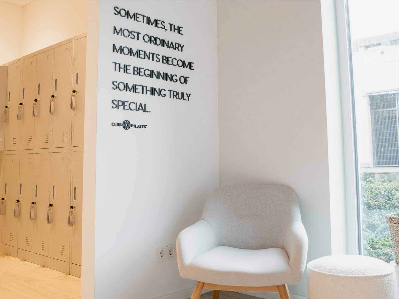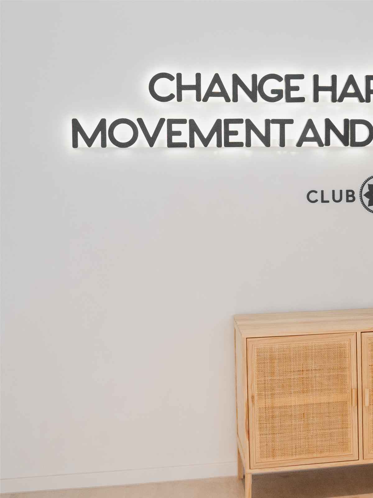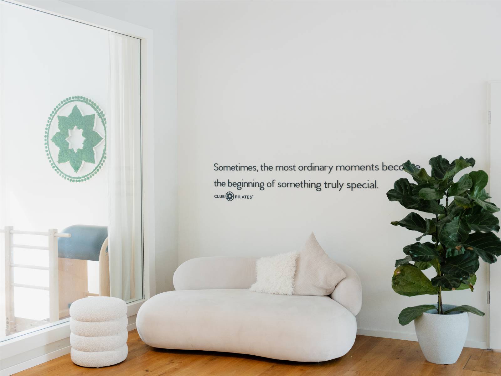 Der Schriftzug heißt ankommende Besucher herzlich willkommen, greift einen zentralen Wert der Pilates-Philosophie auf und schafft eine unmittelbare Verbindung zur Marke Club Pilates. Zudem dient er als stimmungsvoller Hintergrund für Bilder und Videos, die während der Wartezeit häufig entstehen.