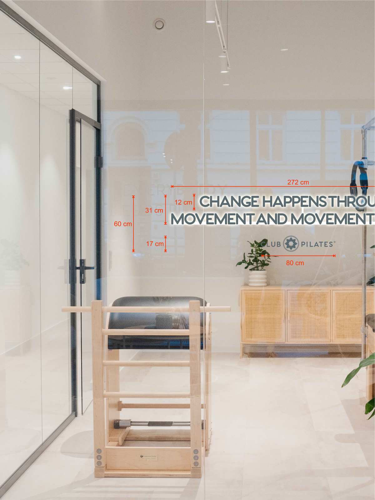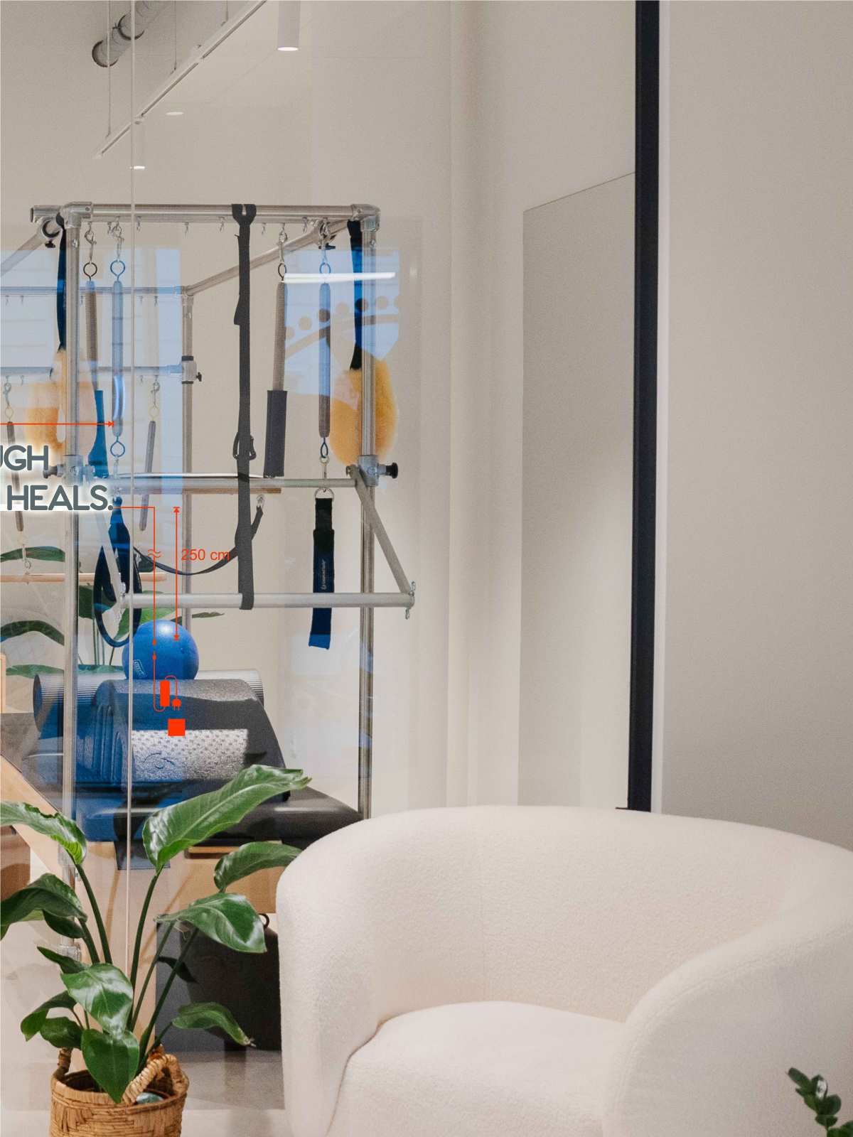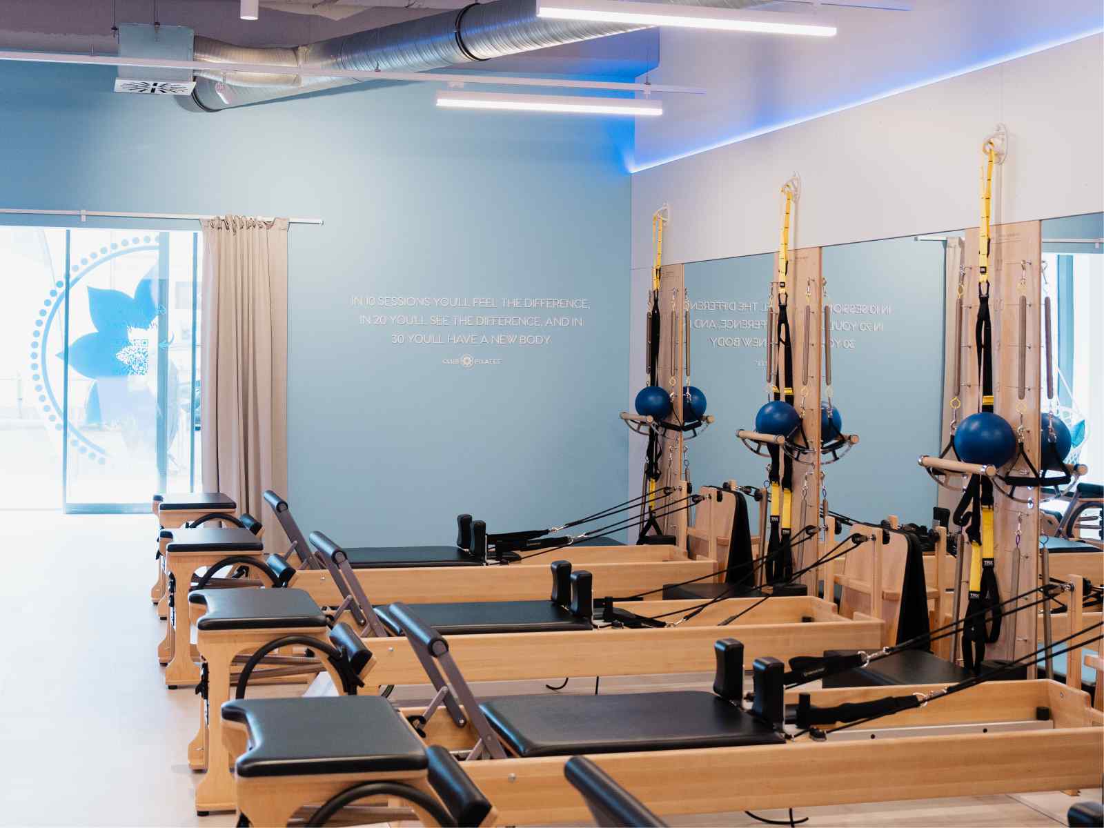 Dezente grafische Elemente und das Wandzitat von Joseph Pilates setzen ruhige visuelle Akzente und verleihen dem Raum eine inspirierende Wirkung. Als prägendes Gestaltungselement rahmt es den Trainingsbereich inhaltlich und unterstützt die atmosphärische Ausrichtung des Raumes.