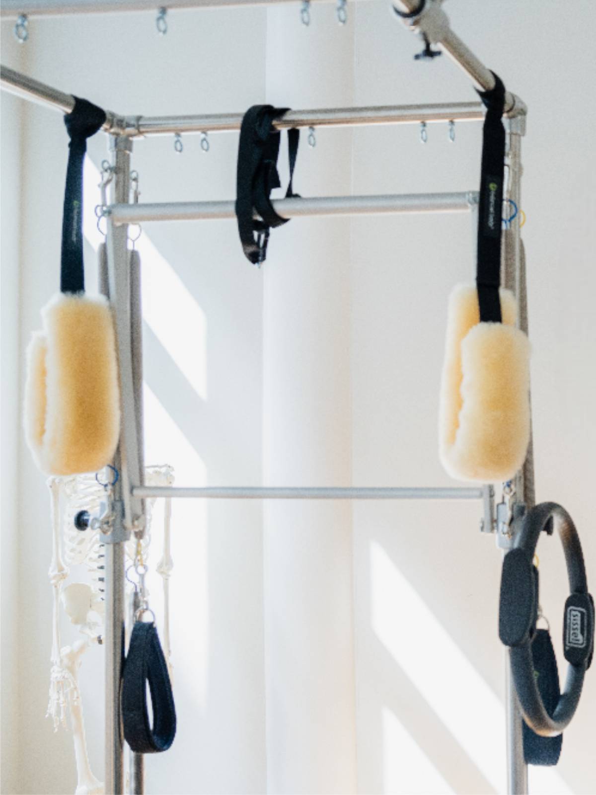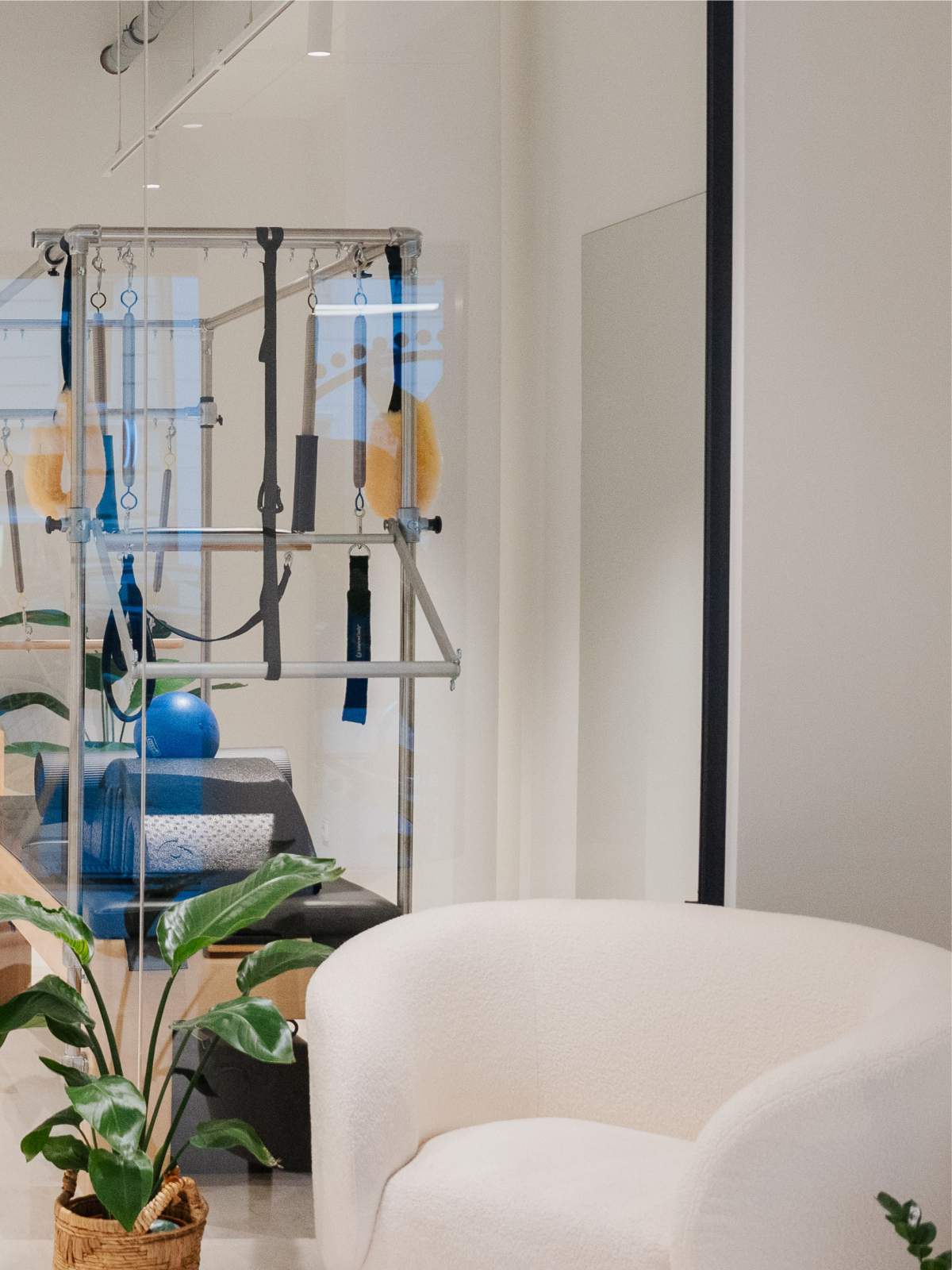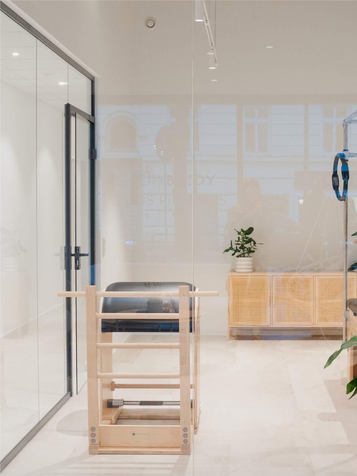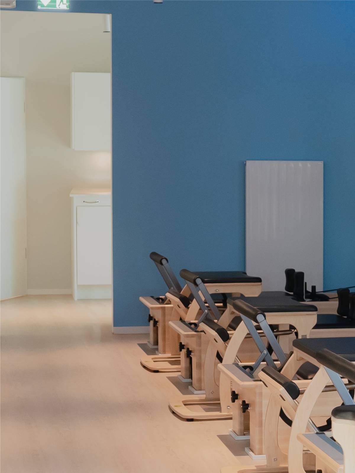 Der lichtdurchflutete Trainingsraum dient als ruhiger, minimalistischer Ort für das Einzeltraining. Warme Holzböden und helle Wandflächen schaffen eine Atmosphäre von Klarheit und Leichtigkeit und unterstützen die bewusste Wahrnehmung des eigenen Körpers während des Trainings.