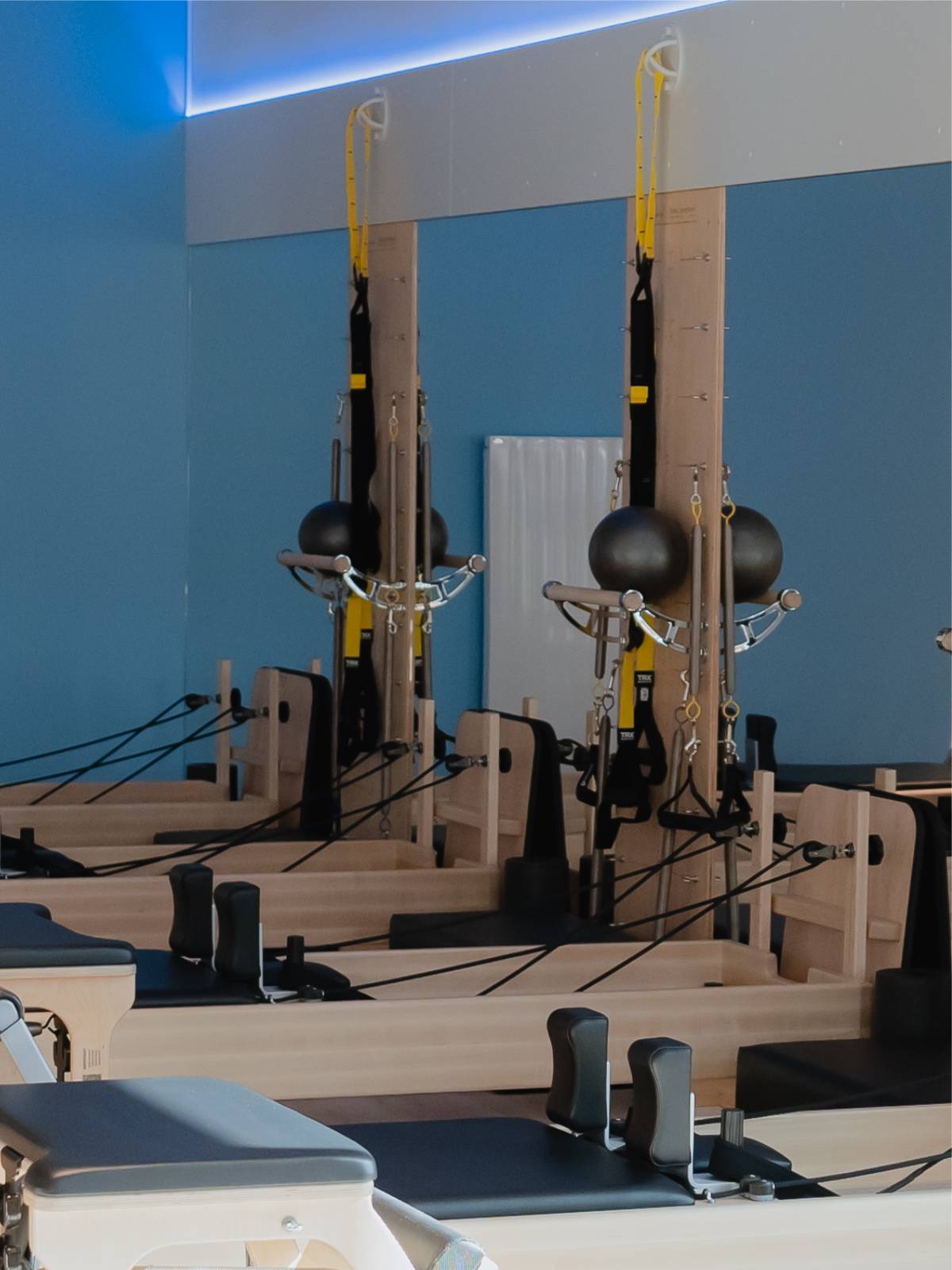 Punktuelle Lichtakzente setzen sowohl die Pilates-Geräte als auch die 3D Buchstaben dezent in Szene.