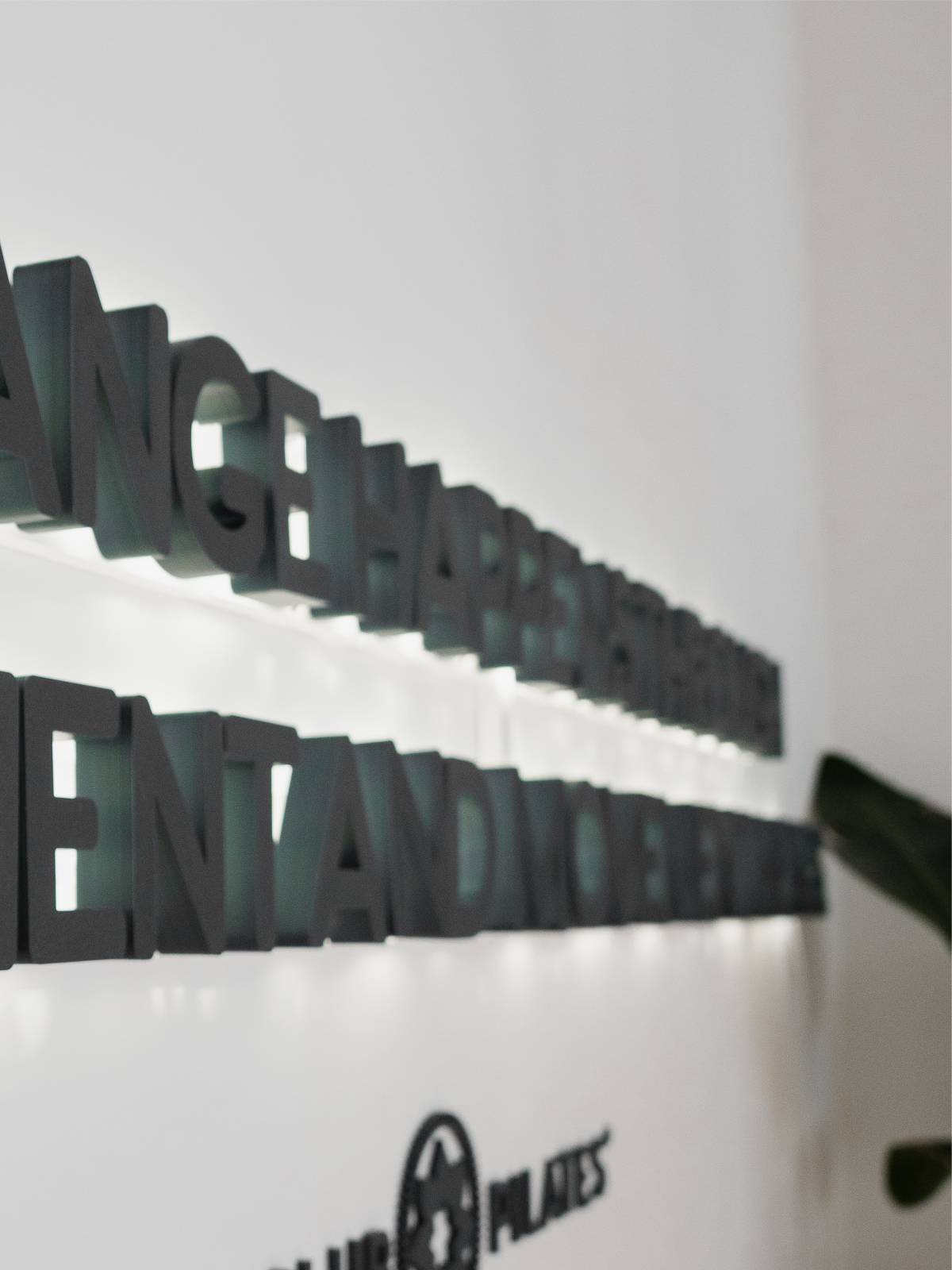 Der markante 3D Schriftzug schafft eine sichtbare Verbindung zwischen der Raumgestaltung und der Philosophie hinter Pilates, indem ein Zitat von Joseph Pilates, dem Begründer des systematischen Körpertrainings, aufgegriffen wird. Der Satz bringt den positiven Einfluss körperlicher Aktivität auf das persönliche Wohlbefinden prägnant auf den Punkt und fügt sich durch die Verwendung der typischen Schrift von Club Pilates harmonisch in das Studiokonzept ein. Ergänzend dazu wird das bestehende Beleuchtungskonzept des Raumes durch die gezielte Ausleuchtung der 3D Buchstaben wirkungsvoll erweitert.