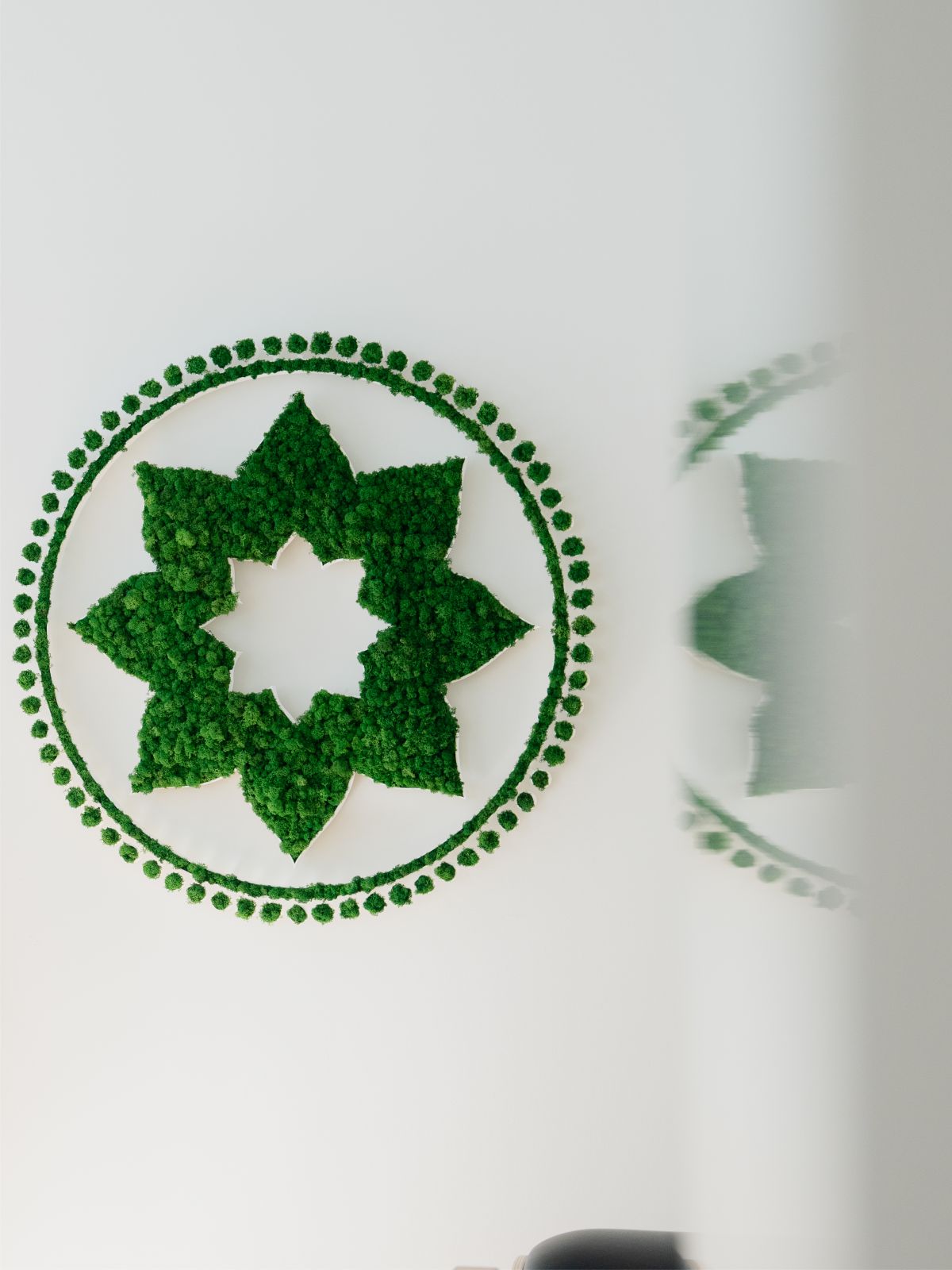 Zentrales Gestaltungselement des Raumes ist das Club Pilates-Superzeichen. Hierfür wurden die Konturen des Superzeichens mit konserviertem, grün eingefärbtem Islandmoos befüllt. Um das organische Logo harmonisch in das Gesamtbild einzubinden, wurde die Farb- und Formgebung des Superzeichens nur teilweise aus dem Corporate Design von Club Pilates übernommen. Die formgebende Schale, in der das Moos eingefasst ist, wurde bewusst in Weiß statt im Corporate-Grau ausgeführt. Das natürliche Moos setzt einen lebendigen, erfrischenden Akzent und fügt sich dadurch fließend in den Raum ein.