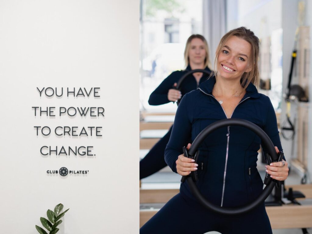 Ein zentrales Gestaltungselement ist der 3D-Schriftzug in den Corporate-Identity-Farben von Club Pilates. Er setzt einen visuellen Akzent und dient gleichzeitig als Wiedererkennungsmerkmal der Club-Pilates-Philosophie, zu der ein wertschätzender Umgang miteinander gehört.