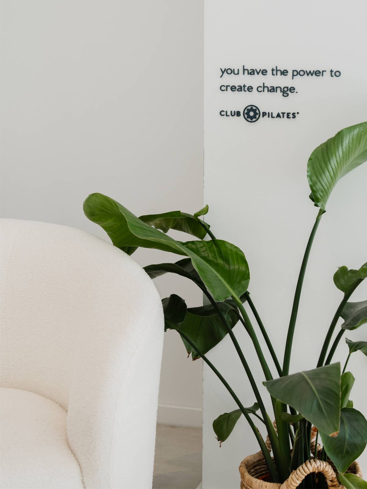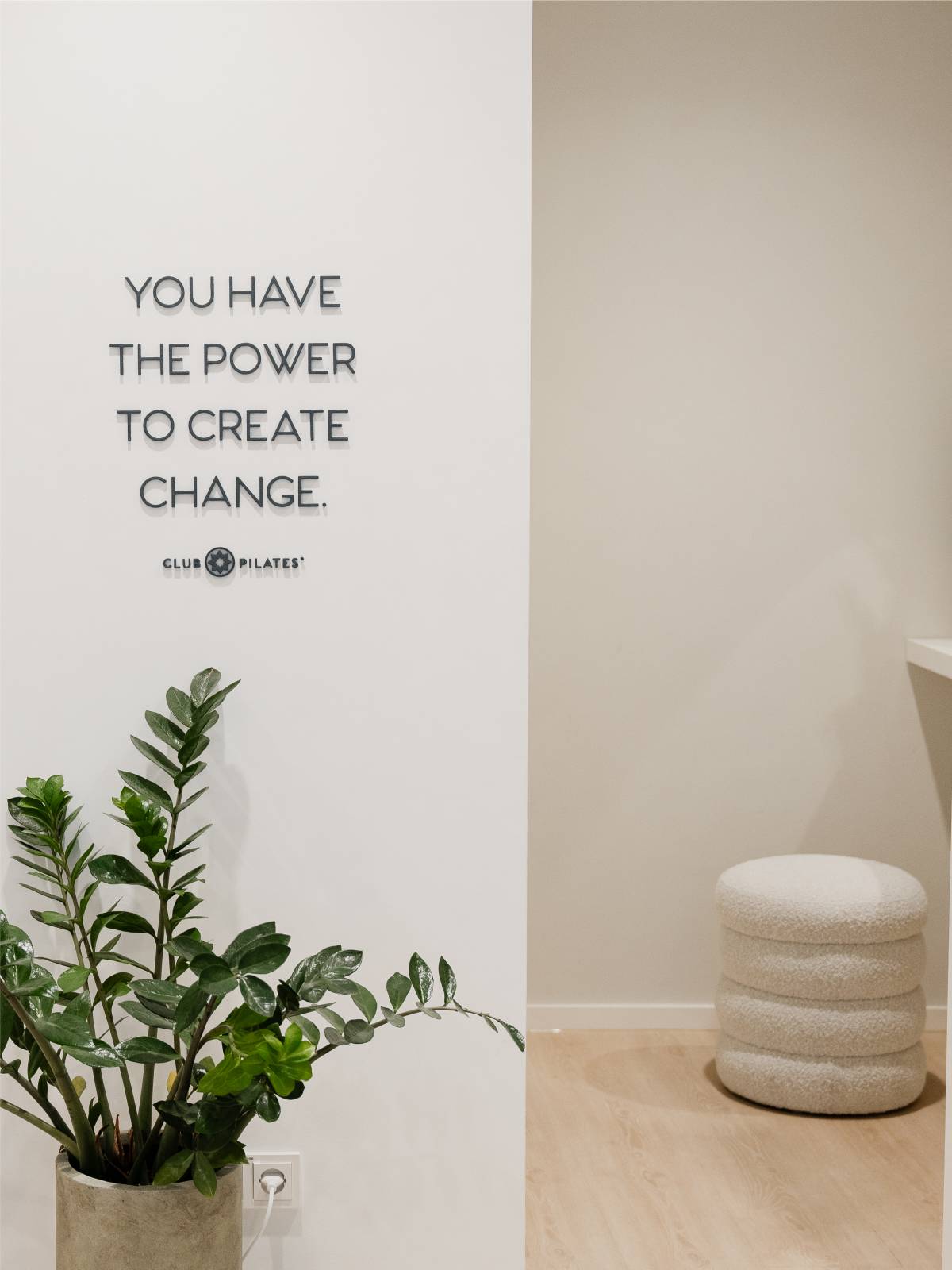 Ein prägendes Gestaltungselement ist der 3D Schriftzug „you have the power to create change“, ergänzt durch das Club-Pilates-Logo. Der Spruch ist bewusst in Augenhöhe positioniert und fügt sich harmonisch in das Gesamtbild ein. Schriftzug, Möblierung und Begrünung bilden eine gestalterische Einheit und verankern die Markenbotschaft subtil, aber wirkungsvoll im Raum.
